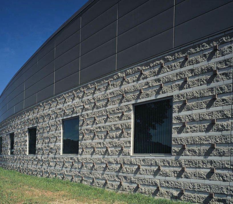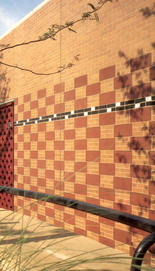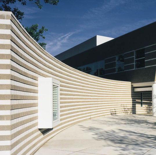 Just about any exterior wall material can be used to create single color and texture, monolithic planes for enclosing the building. These planes can be composed of brick, stucco, EFIS, metal panels, pre-cast concrete, tilt panel concrete, stone, glass, decorative architectural block and frost proof tiles. Oftentimes, a wall plane can rise to a higher level of interest without additional cost by carefully considering the use of textures and colors to create regular or irregular patterns. Even large walls can be made to look smaller in scale if appropriately designed.