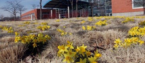 » » Using mass naturalized plantings to establish a framework for defining formal spaces in key locations around buildings, limiting overall maintenance needs.