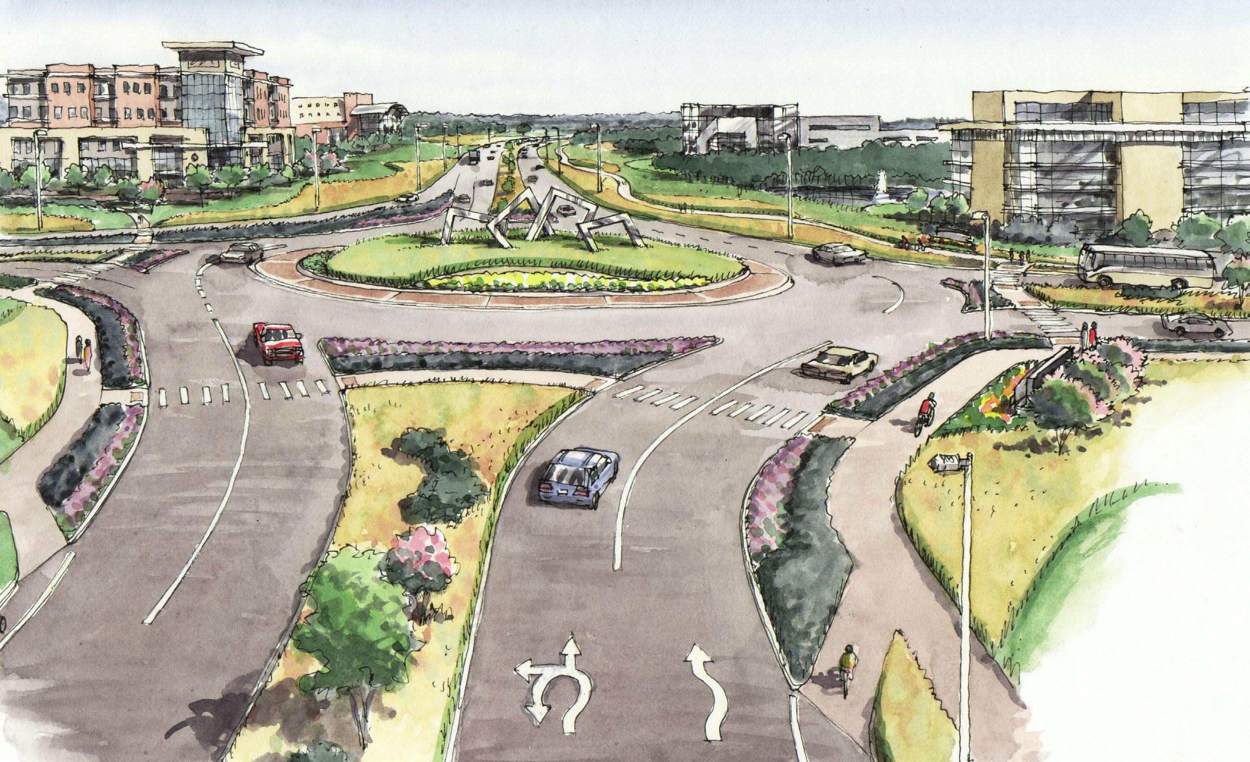 Intersection and crosswalk treatments, as well as landscaping, should establish visual relationships and aesthetically tie elements in the public realm together at key points.