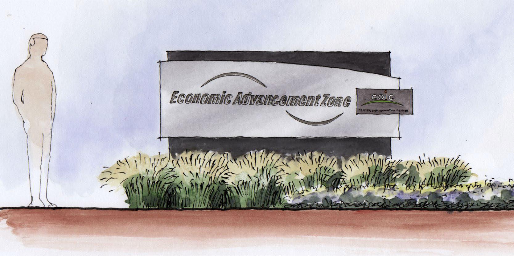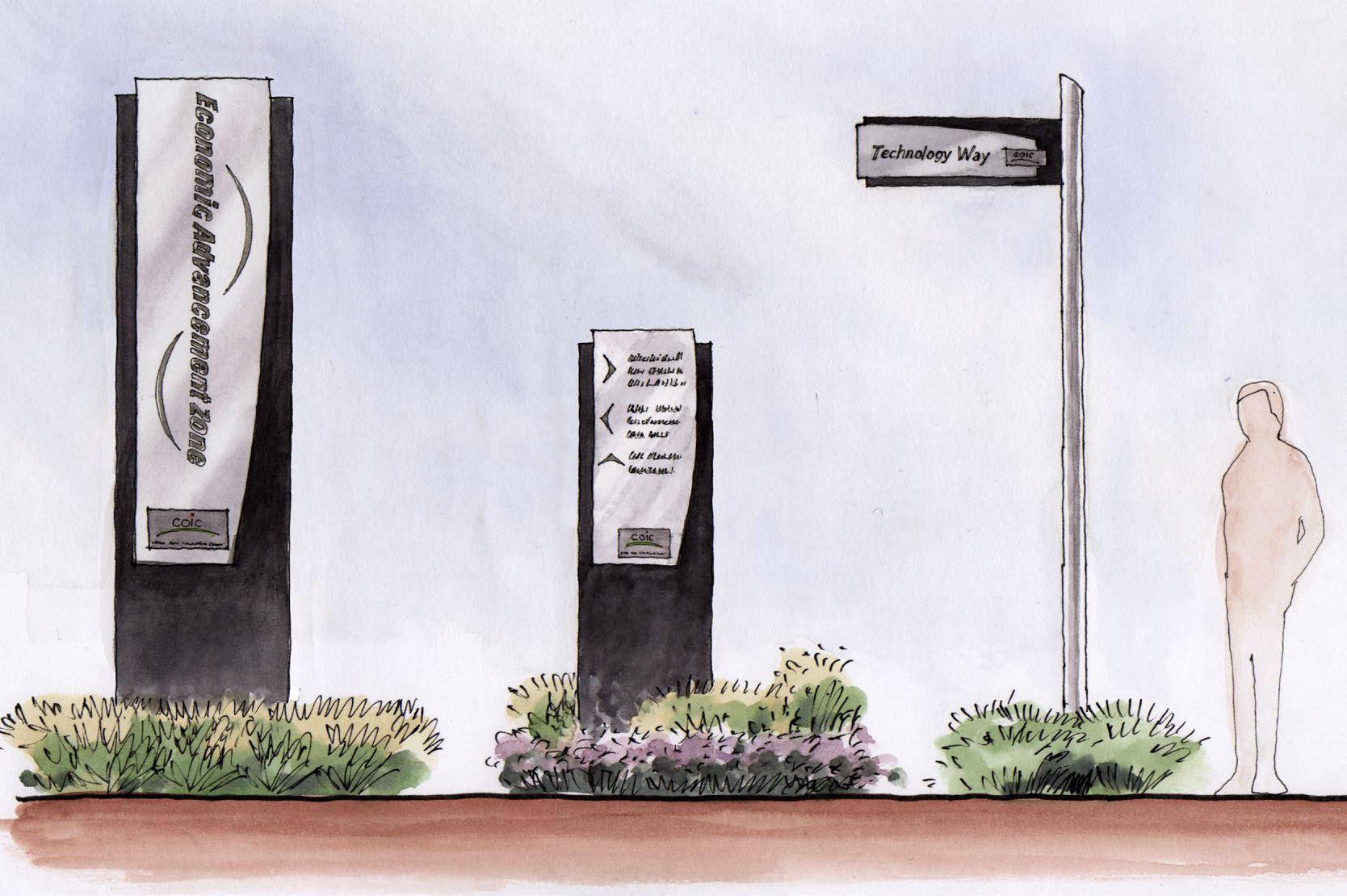 Entry feature and wayfinding signs in the EAZ should implement a contemporary look with material such as chrome and other metals that feel high-tech.