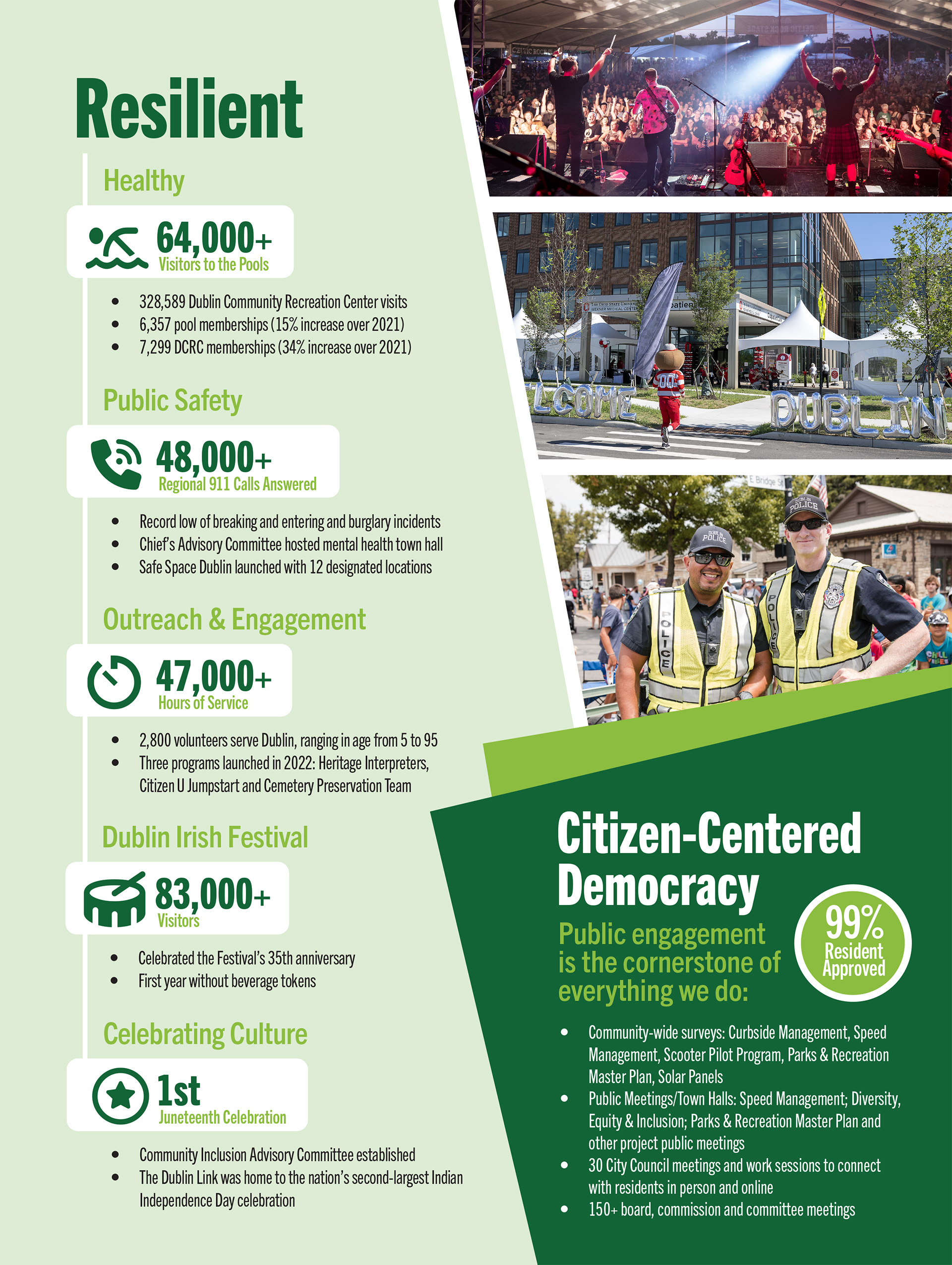 As Dublin grows, our strength lies in our diverse and engaged residents. Our community events, such as the Dublin Irish Festival and various cultural celebrations, continue to bring residents together, celebrating our rich heritage and vibrant community spirit. These gatherings not only strengthen social bonds but also contribute to the cultural fabric that makes Dublin unique.