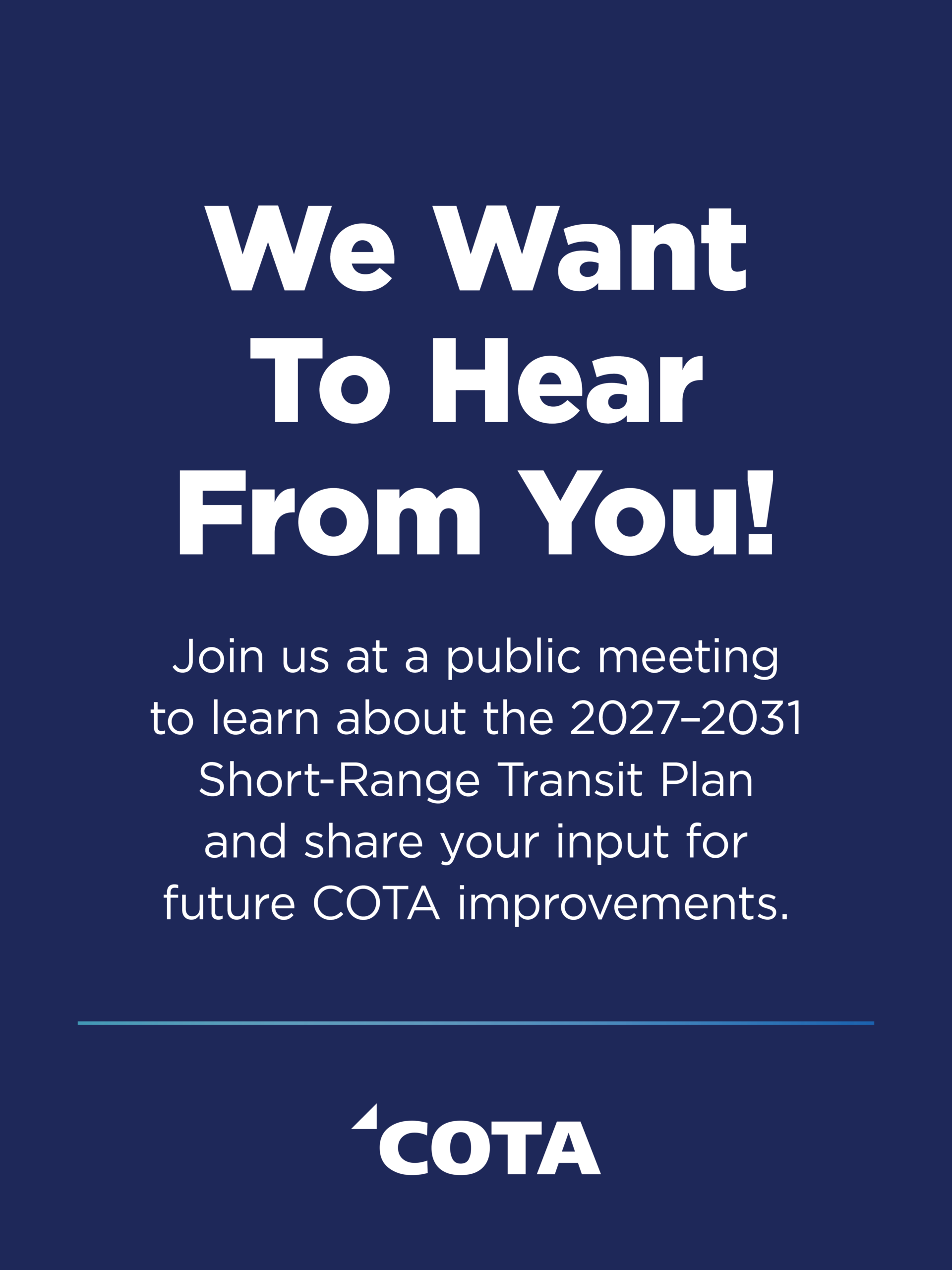 Join COTA at one of five in-person meetings or a virtual session to learn about the draft 2027-2031 Short-Range Transit Plan and share your feedback.