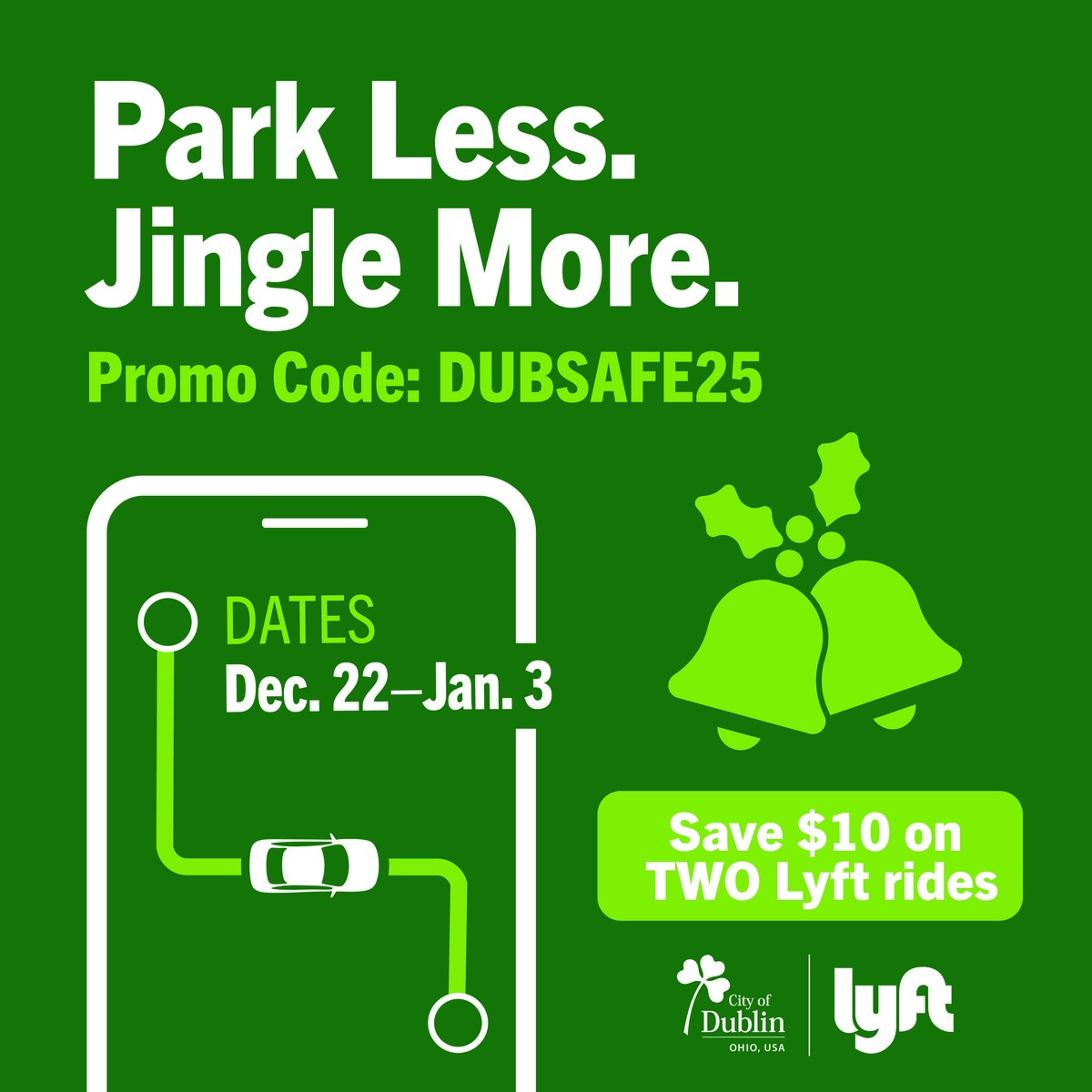 (Dublin, Ohio) —Downtown Dublin is the ultimate holiday destination, with festive lights, unique shopping, cozy dining and New Year’s Eve celebrations lighting up the district. From Dec. 22–Jan. 3, residents and visitors can enjoy all the holiday fun while leaving the driving to someone else, thanks to discounted Lyft rides offered through the City of Dublin’s partnership with Central Ohio Safe Ride.