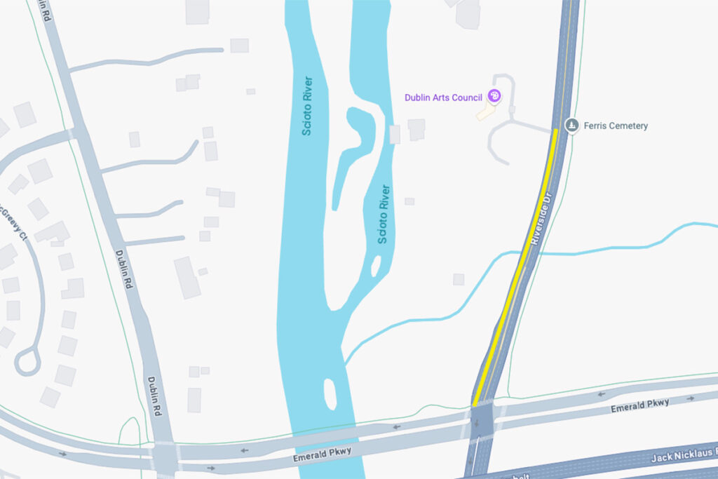 - The southbound right lane of Riverside Drive will be closed through Sept. 19 between the Dublin Arts Council drive and Emerald Parkway for construction of new curbs and gutters, bridge abutment and shared use path.