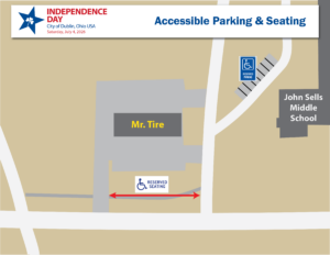 Accessible seating is available on a first-come, first-served basis at the southeast corner of the main stands at the City of Dublin’s Independence Day Evening Celebration. It is recommended that guests utilizing a wheelchair enter the stadium through Gate 2. A ramp for access to the main stands is located just inside Gate 2.
