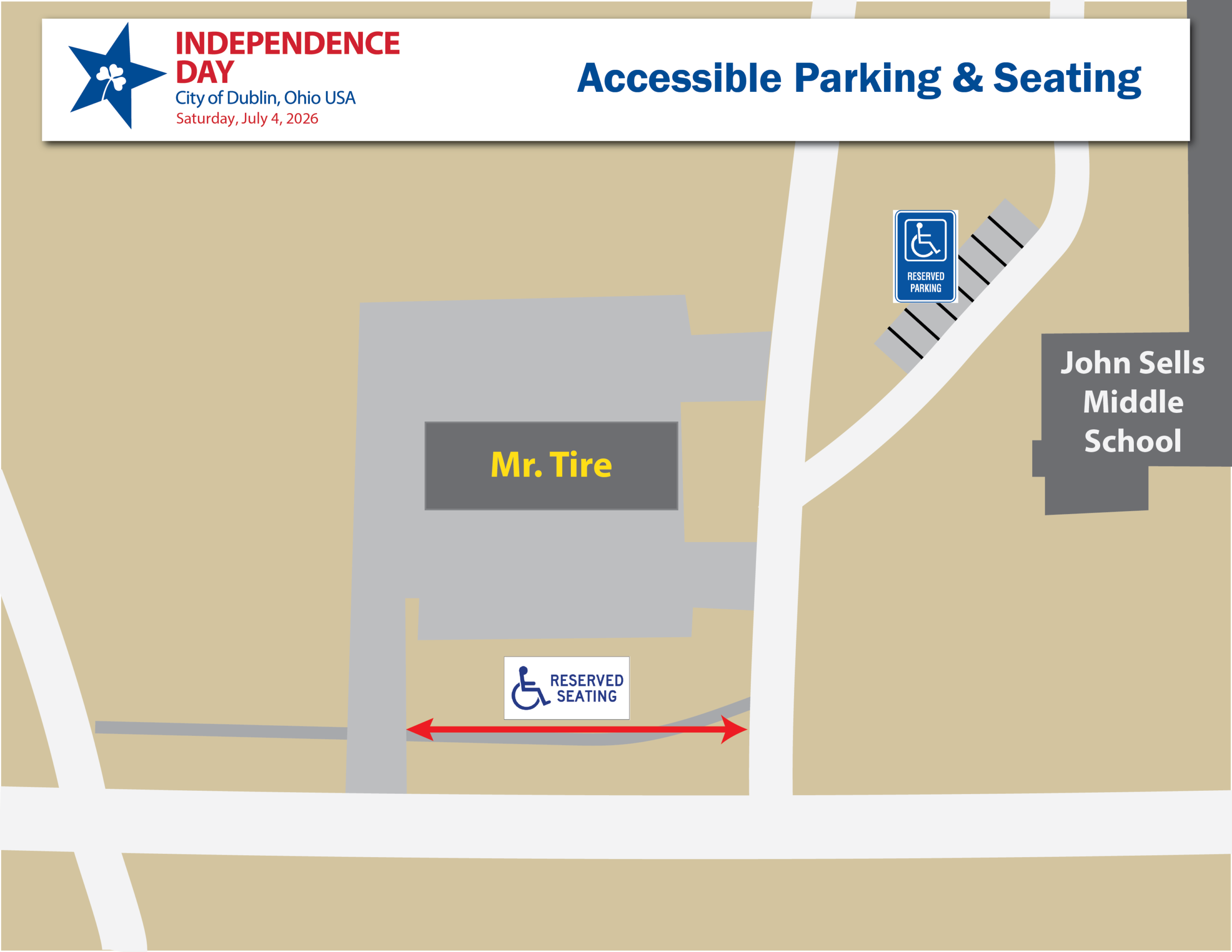 Accessible parking is available on a first-come, first-served basis at the Dublin Coffman High School stadium parking lot. Please have your placard visible to access the Parking Lot.