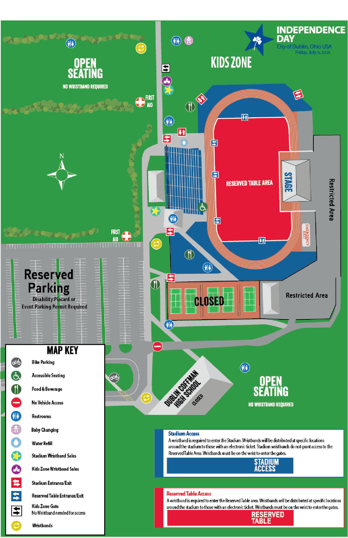 All guests four and older need a stadium or reserved table wristband/online ticket to enter Dublin Coffman High School Stadium. Only reserved table wristbands/online tickets grant access to the reserved table area on the field. Stadium wristbands/tickets grant access to the stadium and offer bleacher seating.