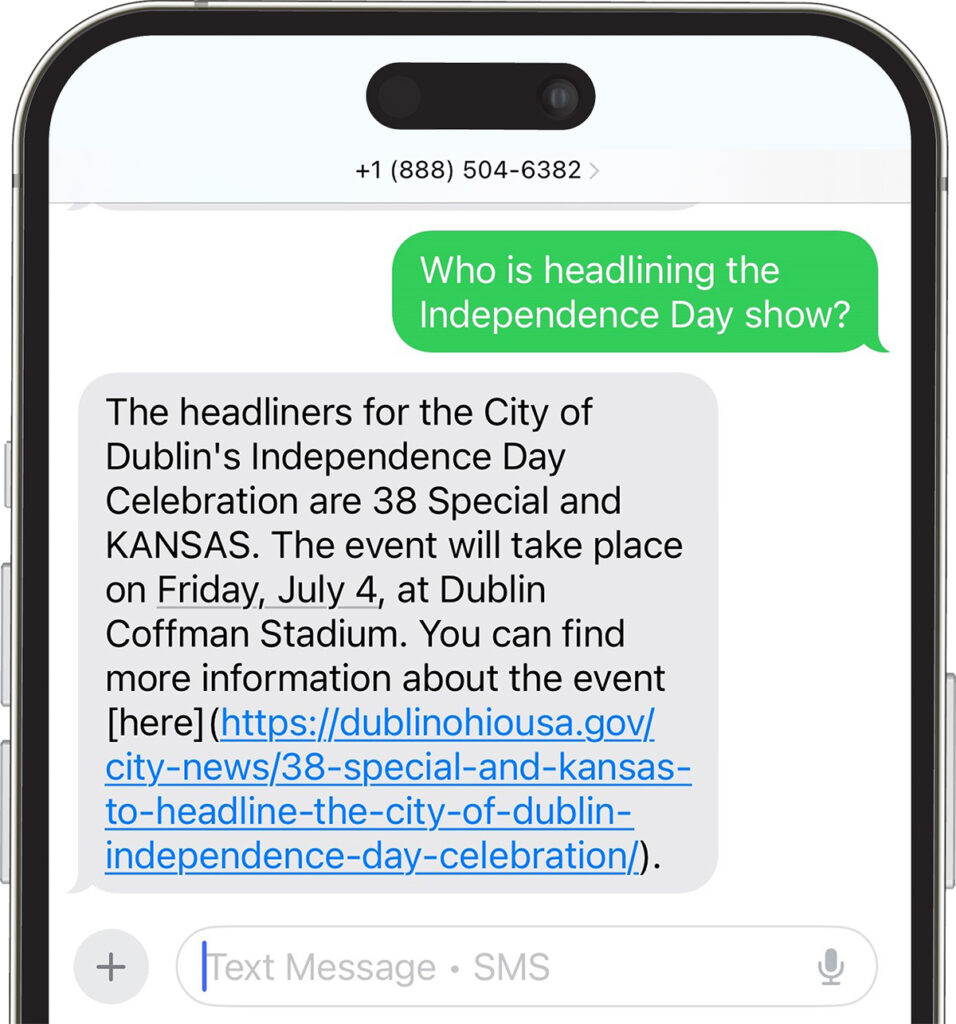 Have a question? Just text it to the same number and get instant, AI-powered answers 24/7. GoDublin TXT keeps you connected so you can focus on the fun.