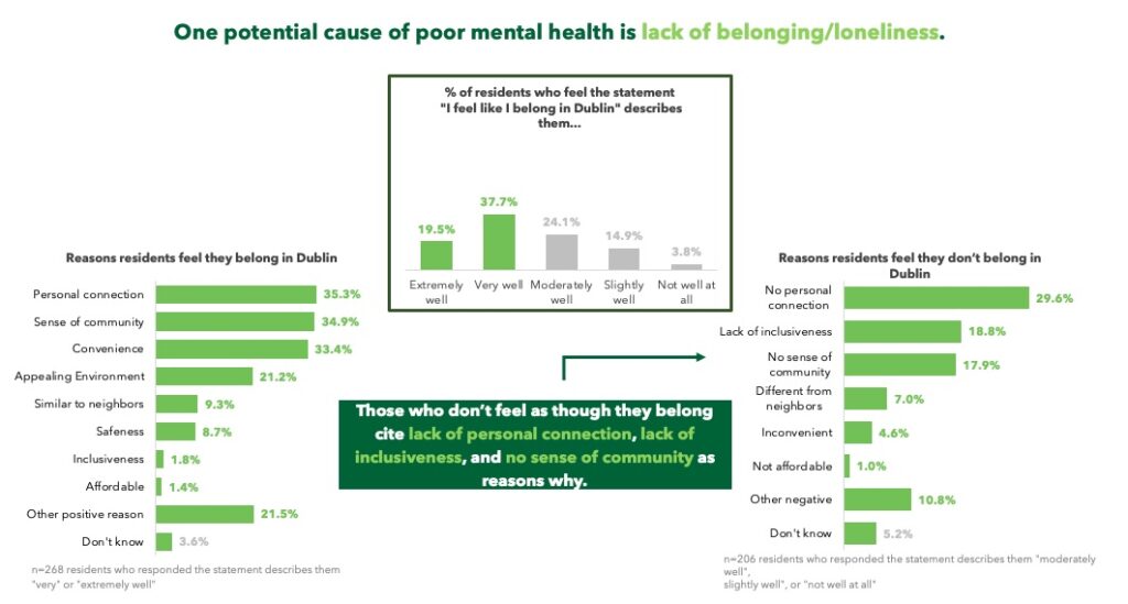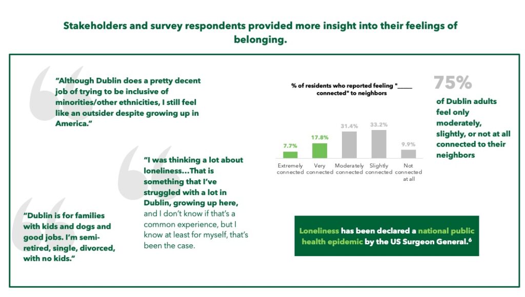 Community Connections — a desire to strengthen the sense of community. According to the representative survey, 43% of Dublin residents feel they belong in Dublin only moderately well, slightly well, or not well at all and 75% feel only moderately connected, slightly connected or not connected at all to their neighbors.