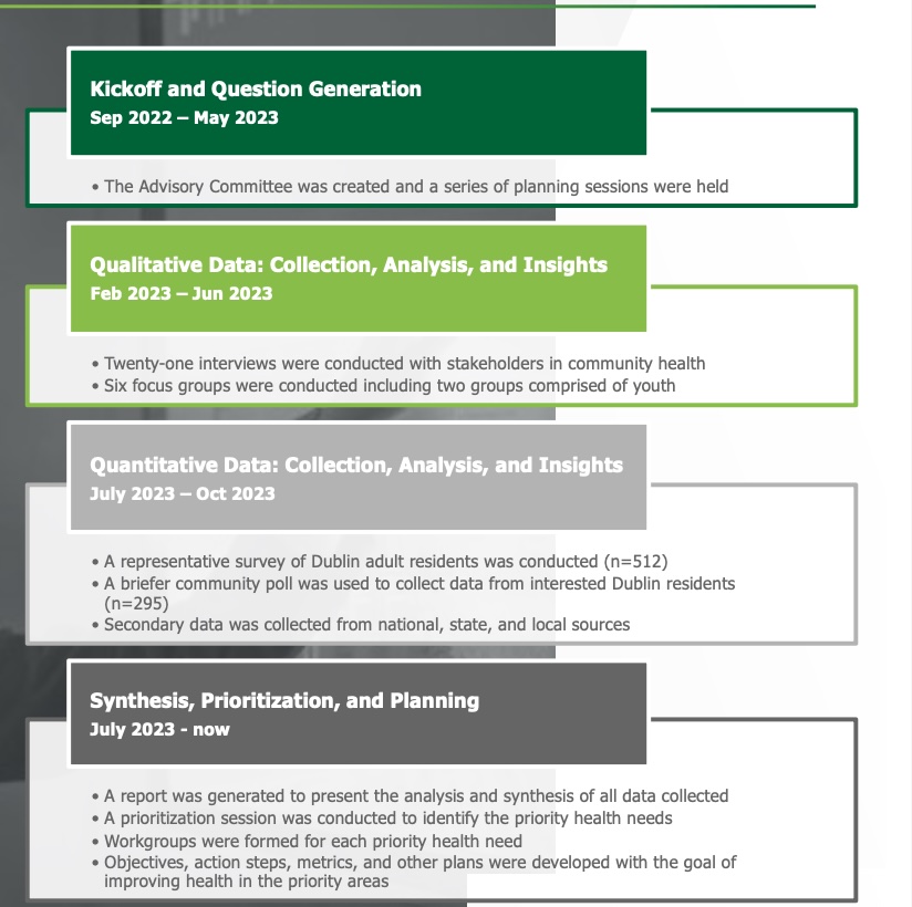 The CHNA is a unique and holistic evaluation of the City’s health and well-being. Initial findings from the assessment were presented to Dublin City Council on May 20, 2024. Read the report to learn more about Dublin’s community health!