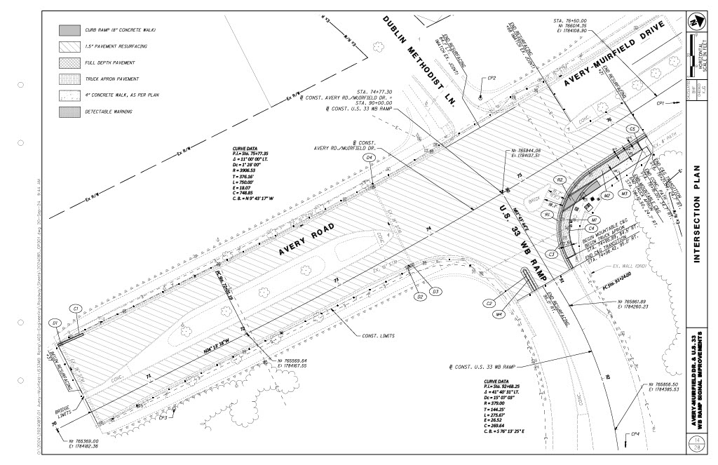 The City has contracted with Strawser Paving for this project, which consists of a new truck apron and sidewalk on the northeast corner of the 33 Westbound ramp to northbound Avery/Muirfield Dr., a new signal pole and new pavement.
