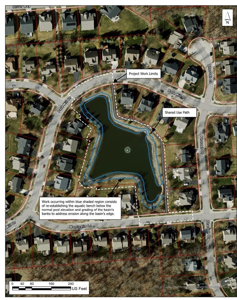 The project will improve the edges of the Park Place stormwater management basin north of Monticello Lane to address areas of erosion. Previously, the water level was lowered by 19 inches to fix an upstream stormwater issue. These improvements will restore the basin’s appearance, re-establish the aquatic bench and stabilize the shoreline.
