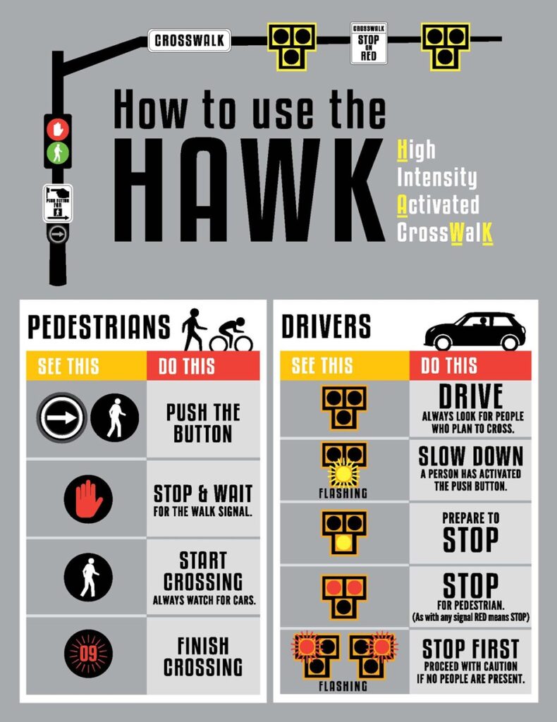 HAWK signals are used at locations where traffic volumes, speeds or road width make crossings more challenging. They provide a higher level of safety by stopping traffic when activated, while still allowing traffic to flow normally when not in use. This makes them a strong fit for busy or complex crossings where a standard crosswalk or flashing beacon may not provide enough protection.
