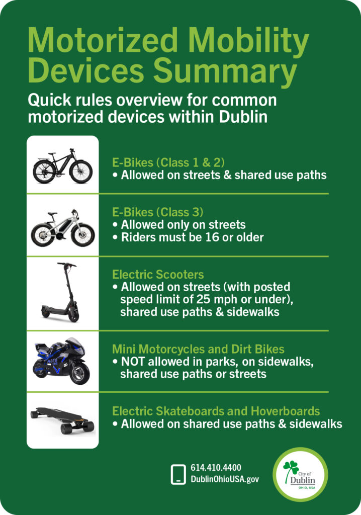 Dublin is on the move and safety comes first! Motorized devices like electric scooters, e-bikes and mini motorcycles, have rules for safe and legal use. These guidelines protect everyone who uses our streets, sidewalks and shared use paths.