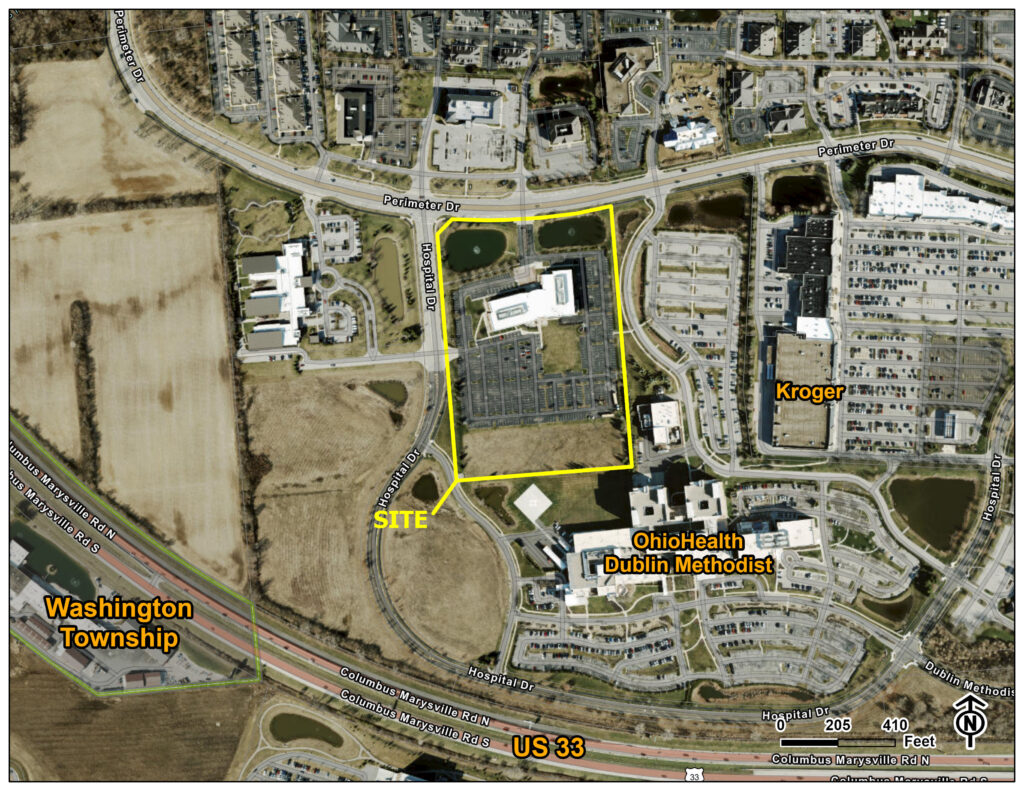 Amended Final Development Plan for the construction of a temporary helipad for OhioHealth Dublin Methodist Hospital. The 13.3-acre site is zoned PCD, Perimeter West and is located southwest of the intersection of Perimeter Drive and Hospital Drive.
