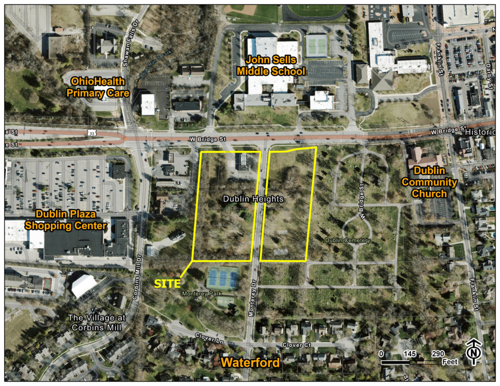 Request for review and non-binding feedback for a commercial development consisting of approximately 93,900 square feet of retail and eating and drinking space and associated site improvements. The 6.86-acre site is zoned BSD-HTN, Bridge Street District – Historic Transition Neighborhood, and is located on both sides of Monterey Drive, south of its intersection with W. Bridge Street.