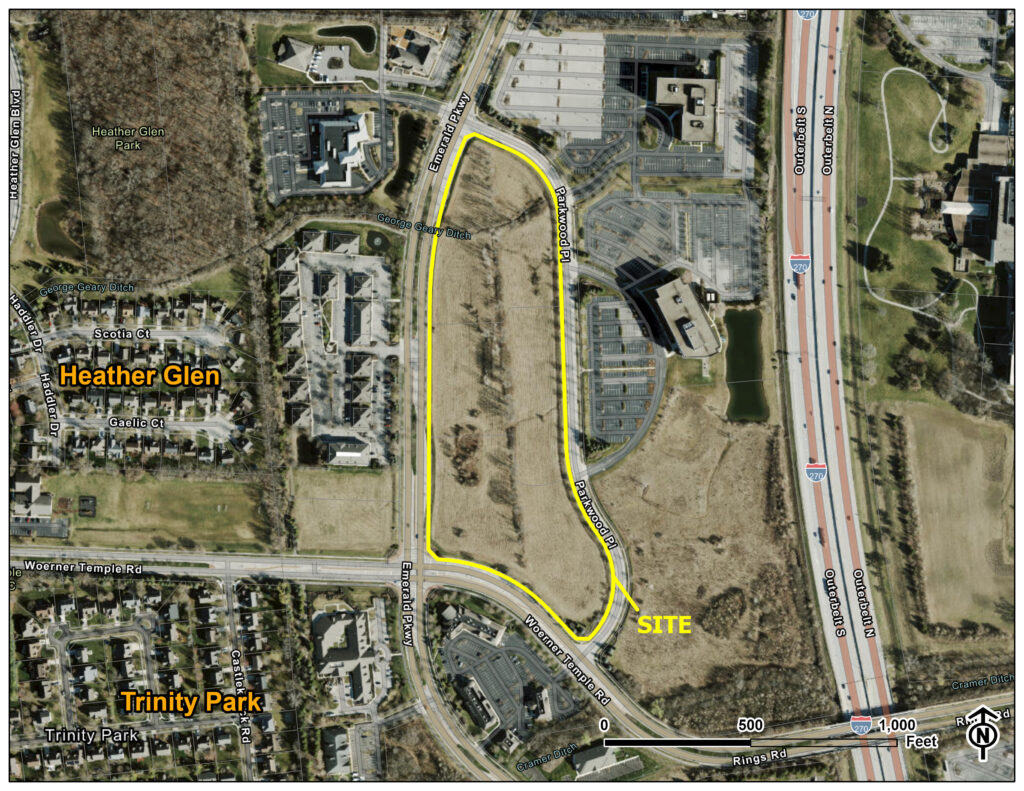 Request for review and non-binding feedback for the construction of a new mixed-use development. The 16-acre site is currently zoned Planned Commerce District, PCD-Thomas Kohler and is located at the northeast corner of the intersection of Emerald Parkway and Woerner Temple Road.