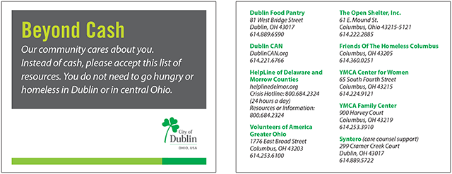 Dublin Police officers also carry community resource cards to direct panhandlers to the help they need.